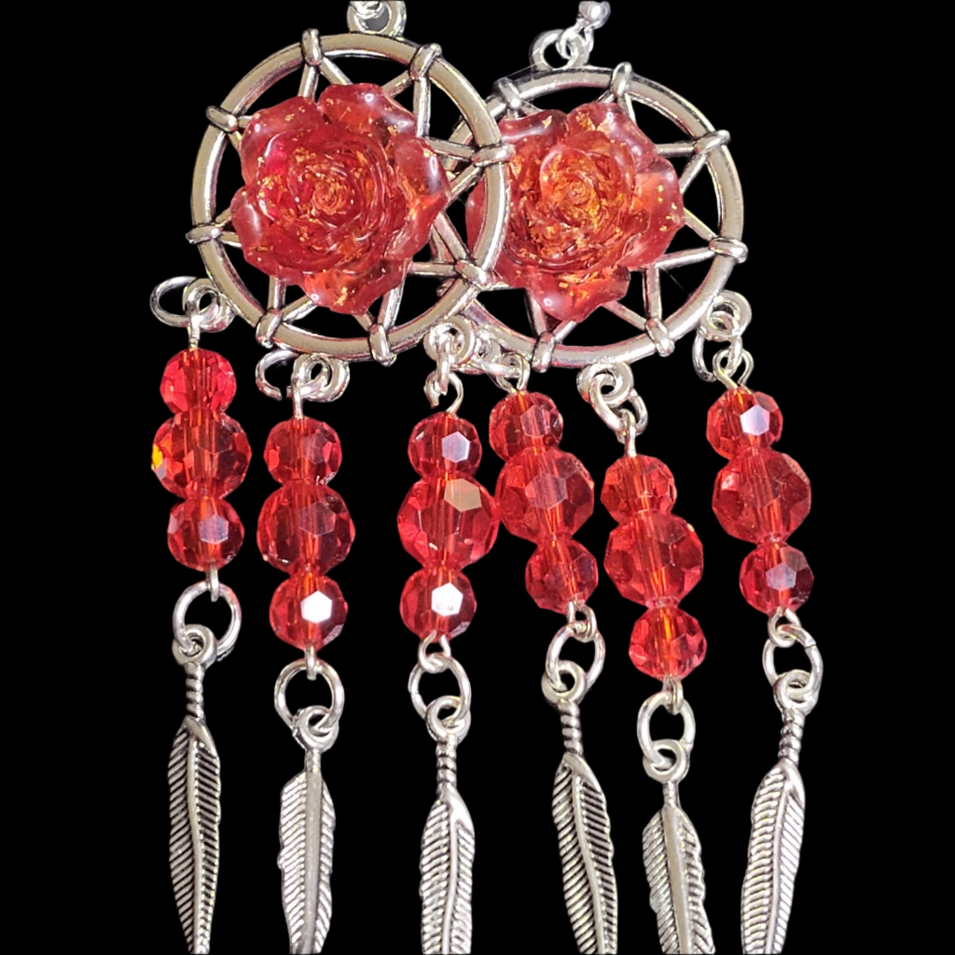 Catch compliments with these bold dreamcatcher earrings, featuring radiant red roses, shimmering beads, and dangling silver feathers. Perfect for adding a fierce touch to any outfit.