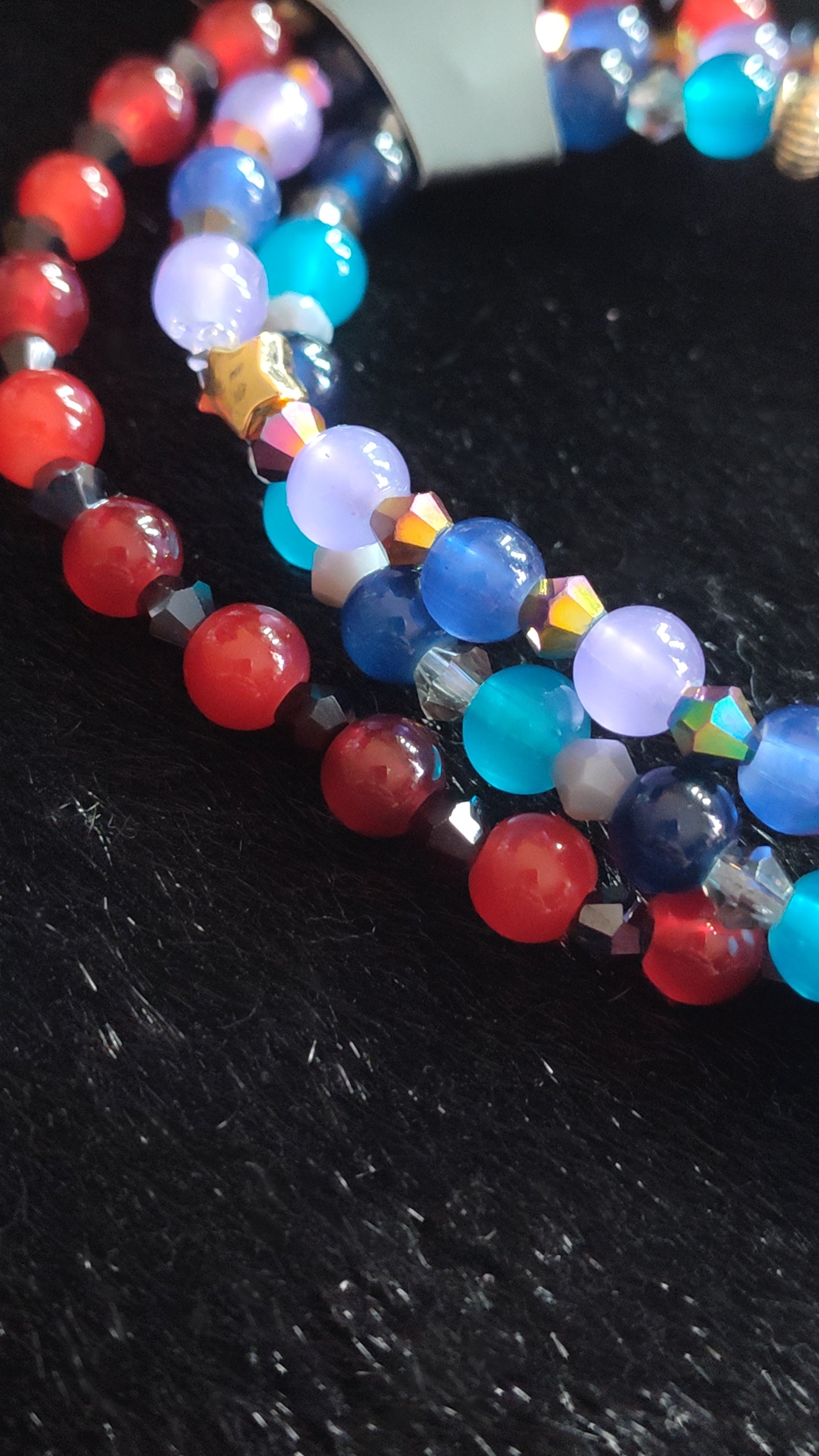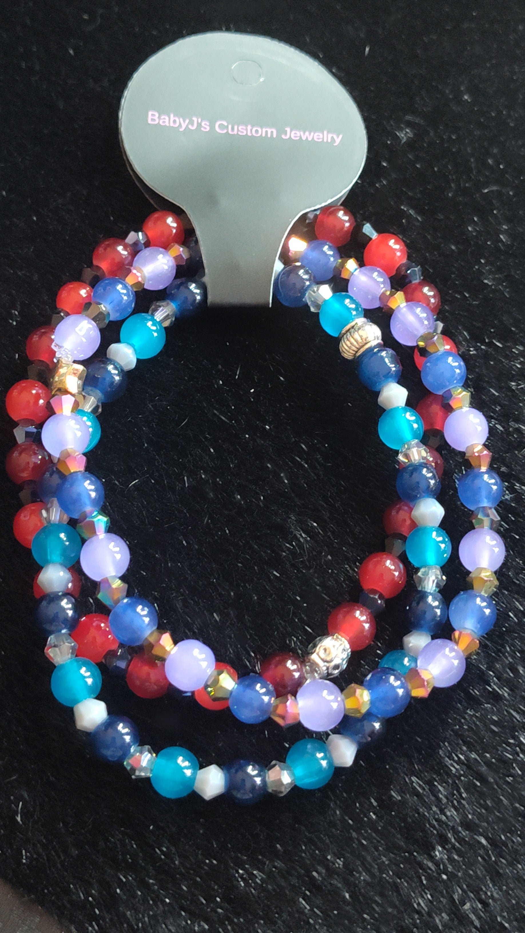 A fun and colorful stack of red, blue, purple, and turquoise beads with gold and silver accents. Perfect for everyday wear with a bold, playful twist. 3 piece set